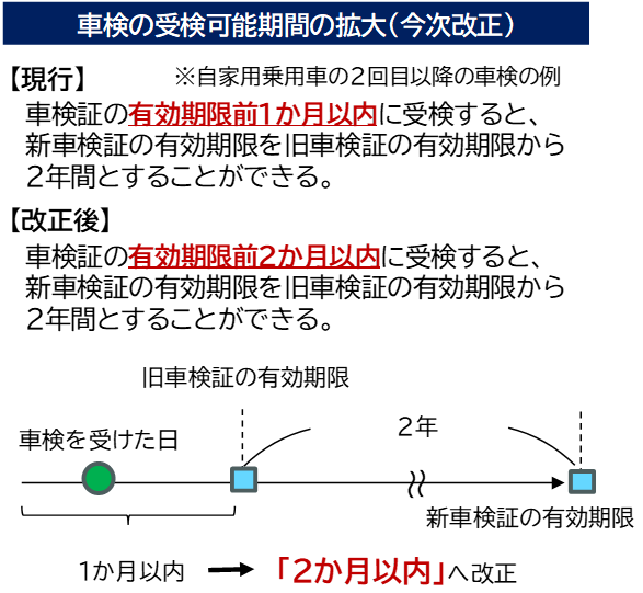 2か月前から満了日までの間」に受検しても、残存する有効期間が失われないこととしました。また、自賠責保険の有効期間もこれに整合させるため自動車損害賠償保障法施行規則を改正しました。(いずれも