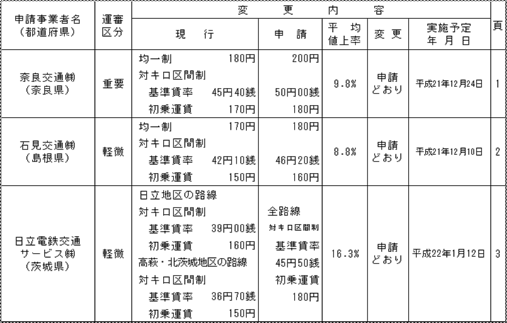 また、石見交通(株)及び日立電鉄交通サービス(株)から申請のあった乗合バスの上限運賃変更についても、本日、運輸審議会よりそれぞれ「軽微な事案と認定」されました。これを受けて、本日、認可する予定です。