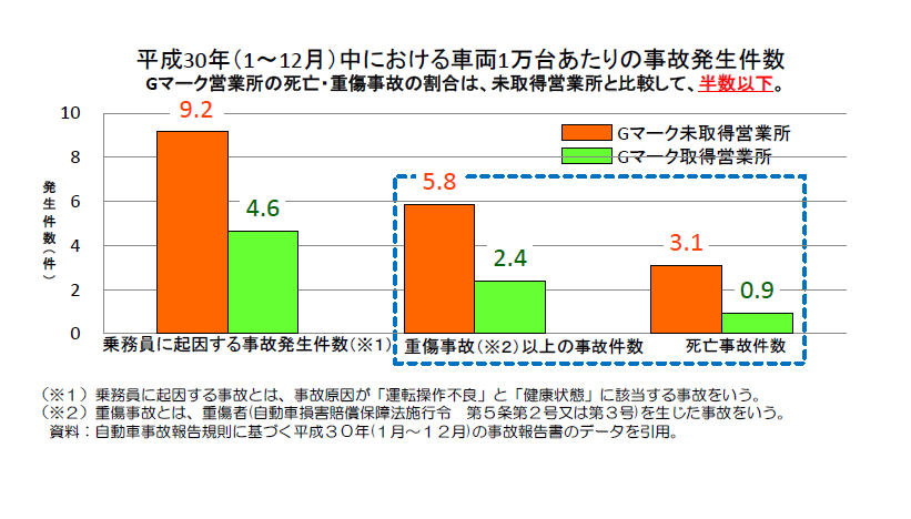 平成30年(1月~12月)の事業用トラック1万台あたりの事故件数をとりまとめたところ、Gマーク認定を取得したトラックの死亡・重傷事故の件数は、認定を取得していないトラックと比較して半数以下となっています。