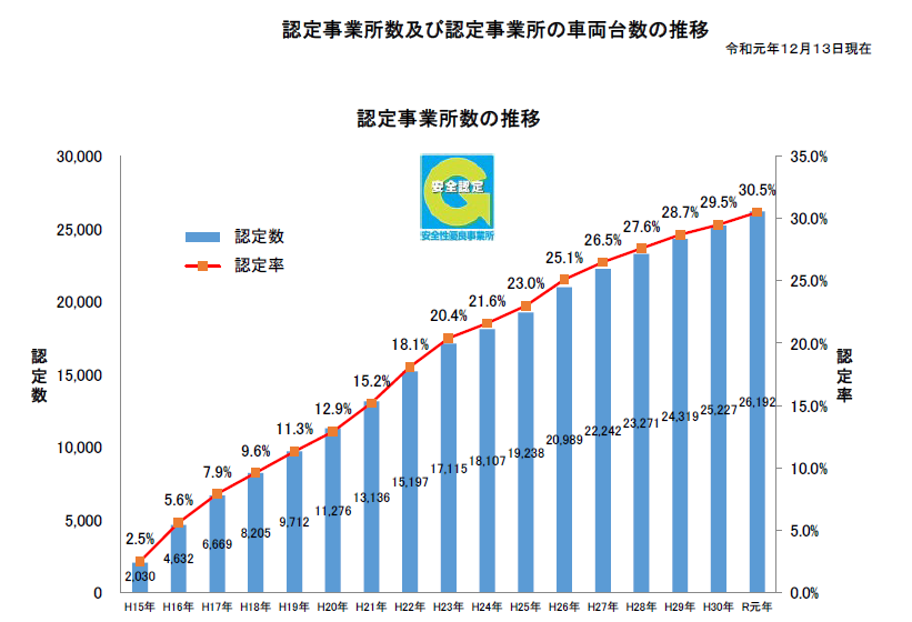 今回の認定により、Gマーク事業所は全国で26,192事業所(全てのトラック事業所の30.5%。対前年度比1.0%増。)となり、更に、安全運行を励行するトラックが増えています。