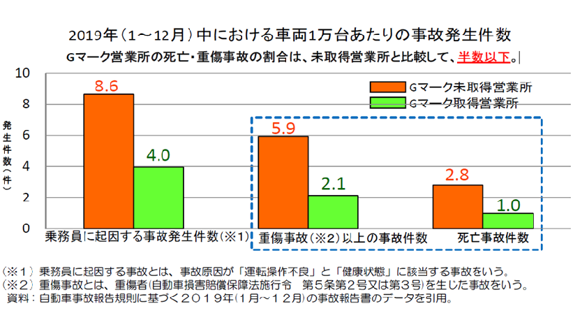 2019年(1月~12月)の事業用トラック1万台あたりの事故件数をとりまとめたところ、Gマーク認定を取得したトラックの死亡・重傷事故の件数は、認定を取得していないトラックと比較して半数以下となっています。