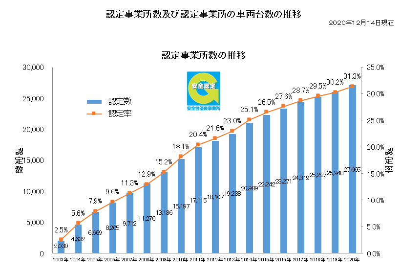 今回の認定により、Gマーク事業所は全国で27,065事業所(全てのトラック事業所の31.3%。対前年度比0.8%増。)となり、更に、安全運行を励行するトラックが増えています。