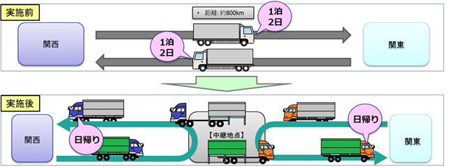 | 中継輸送は長距離運行を複数のドライバーで分担し、日帰り勤務が可能となる輸送形態であり、労働負担の軽減や担い手の拡大に繋がります。国土交通省では、中継輸送の取組事例を公表し、更なる普及を促進するため、各事業者で取り組まれている中継輸送の取組事例を広く募集します。 |