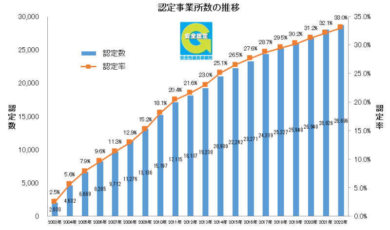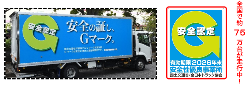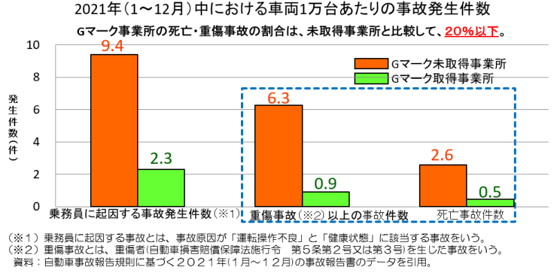 | Gマーク(安全性優良事業所)は、全日本トラック協会が認定(国土交通省推奨)する評価制度です。 今回の認定により、Gマーク事業所は全国で28,696事業所(全てのトラック事業所の33.0%。対前年度比0.9ポイント増。)となり、更に、安全運行を励行するトラックが増えています。 トラックはひとたび事故を起こせば、重大事故に発展することが多く、被害は甚大です。 2021年(1月~12月)の事業用トラック1万台あたりの事故件数をとりまとめたところ、Gマーク認定を取得したトラックの死亡・重傷事故の件数は、認定を取得していないトラックと比較して20%以下となっています。 |