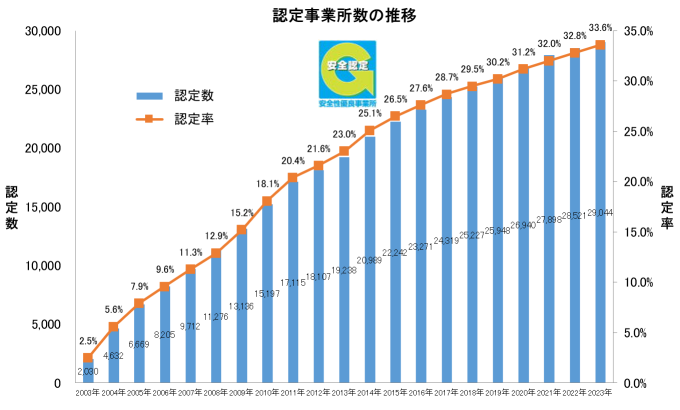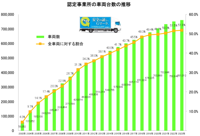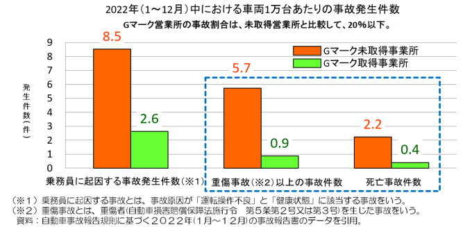 | Gマーク(安全性優良事業所)は、全日本トラック協会が認定(国土交通省推奨)する評価制度です。 今回の認定により、Gマーク事業所は全国で29,044事業所(全てのトラック事業所の33.6%、対前年度比0.8ポイント増。)となり、更に、安全運行を励行するトラックが増えています。 トラックはひとたび事故を起こせば、重大事故に発展することが多く、被害は甚大です。 2022年(1月~12月)の事業用トラック1万台あたりの事故件数をとりまとめたところ、Gマーク認定を取得したトラックの死亡・重傷事故の件数は、認定を取得していないトラックと比較して20%以下となっています。 |