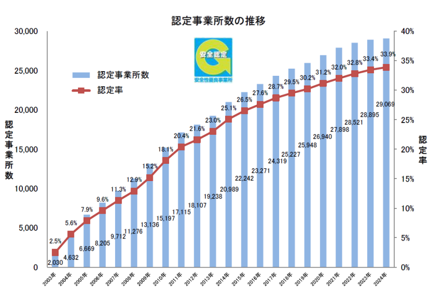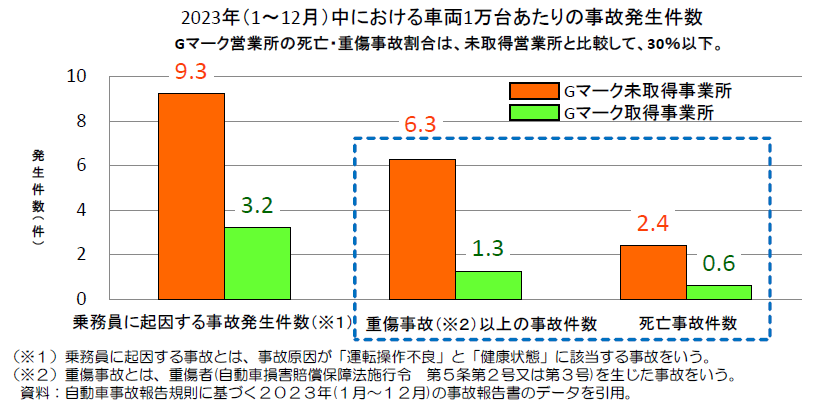 | Gマーク(安全性優良事業所)は、全日本トラック協会が認定(国土交通省推奨)する評価制度です。 今回の認定により、Gマーク事業所は全国で29,069事業所(全てのトラック事業所の33.9%、対前年度比0.5ポイント増。)となり、更に、安全運行を励行するトラックが増えています。 トラックはひとたび事故を起こせば、重大事故に発展することが多く、被害は甚大です。 2023年(1月~12月)の事業用トラック1万台あたりの事故件数をとりまとめたところ、Gマーク認定を取得したトラックの死亡・重傷事故の件数は、認定を取得していないトラックと比較して30%以下となっています。 |