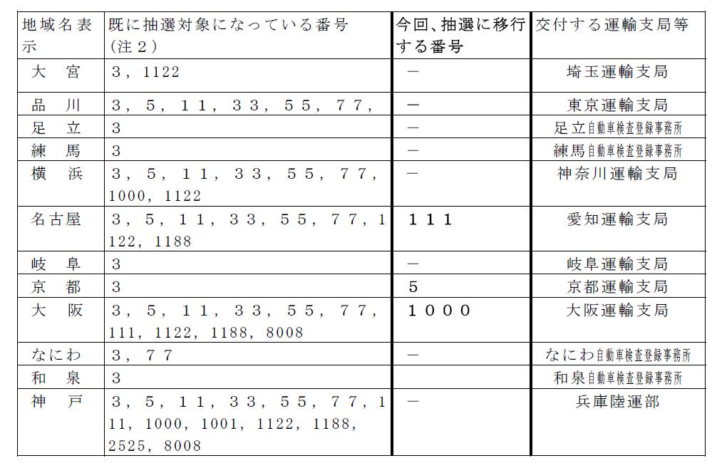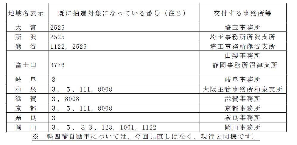 (注2)下記の13とおりは、全ての運輸支局等、軽自動車検査協会事務所等において抽選希望ナンバーとなっている番号です。