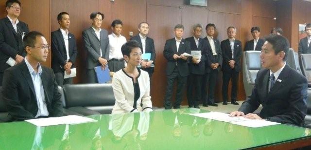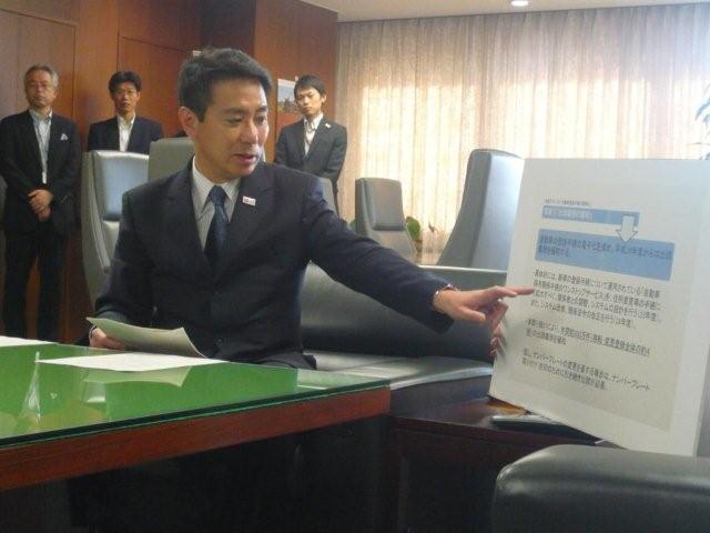 9月3日、今年5月に実施された「政策グランプリ~大臣ダイレクト~」においてグランプリ受賞となった提案「自動車登録手続きの簡略化」についてのフォローアップが開催されました。蓮舫行政刷新担当大臣及び提案者である山本弘一郎氏が前原国土交通大臣を訪問し、前原大臣が国土交通省の検討状況についてプレゼンテーションを行いました。