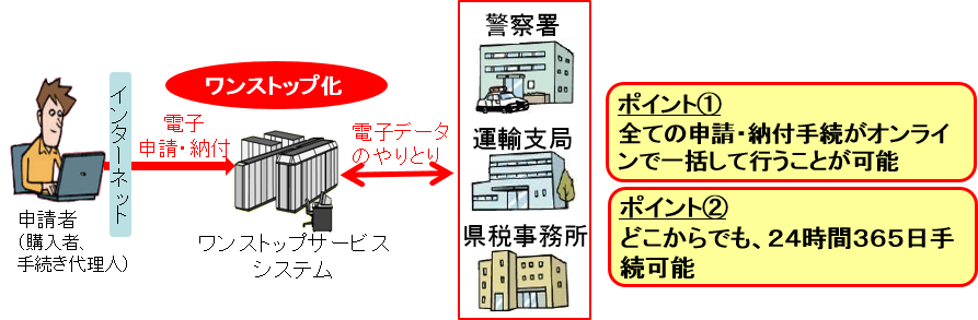 | 自動車の手続は、検査・登録(国土交通省)、保管場所証明(警察)、税(国・県)と複数の官署にまたがり、ユーザーや手続の代行を行っている者にとって複雑なものとなっておりましたが、平成29年4月3日より、これらの手続をオンラインで一括申請出来るワンストップサービス(OSS)の対象を拡大します。 |