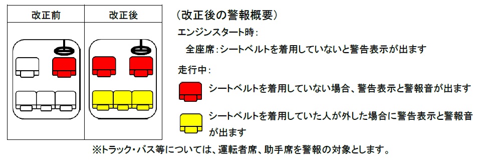 | 今般、シートベルトが装着されていない場合にその旨を運転者に警報する装置(シートベルトリマインダー)の対象座席を拡大する国際基準等の改正案が採択され、我が国においても導入します。 また、車室内の運転者の様子を録画するドライブレコーダーの映像が安全運転指導や事故調査・分析等に利活用されることに鑑み、前面ガラスに運転者用のドライブレコーダーを設置することができるようにします。 |