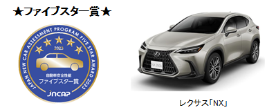 | 国土交通省とナスバ((独)自動車事故対策機構)が自動車の安全性能を評価・公表する「自動 車アセスメント」において、レクサス「NX」が最高評価の「ファイブスター賞」を受賞しました! |