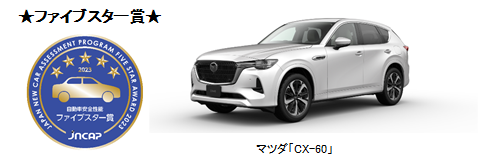 | 国土交通省とナスバ((独)自動車事故対策機構)が自動車の安全性能を評価・公表する「自動 車アセスメント」において、マツダ「CX-60」が最高評価の「ファイブスター賞」を受賞しました! |