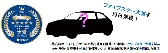 | 5月28日(火)、令和5年度の自動車アセスメントにおいて、優れた成績を収めた車種を 賞する「自動車アセスメント表彰式」を開催します。 表彰式では、「ファイブスター大賞」の発表・表彰を行うとともに、衝突試験を実施した実 際の試験車両の展示を行います。 |