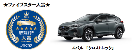 | 自動車の安全性能を評価・公表する自動車アセスメントにおいて、最高評価にあたる 「ファイブスター賞」を獲得した10車種のうち、スバル「クロストレック/インプレッサ」が最高得点を獲得し「ファイブスター大賞」に輝きました。 |