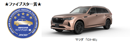 | 国土交通省とナスバ((独)自動車事故対策機構)が自動車の安全性能を評価・公表する「自動車アセスメント」において、マツダ「CX-80」が最高評価の「ファイブスター賞」を受賞しました! 今年度より、交差点における事故に対応した「衝突被害軽減ブレーキ」の評価、相手車への影響も考慮した「新オフセット前面衝突」の評価等を新たに導入※1するとともに、交通標識認識システム(TSR)に関する情報提供※2を始めています。 |
