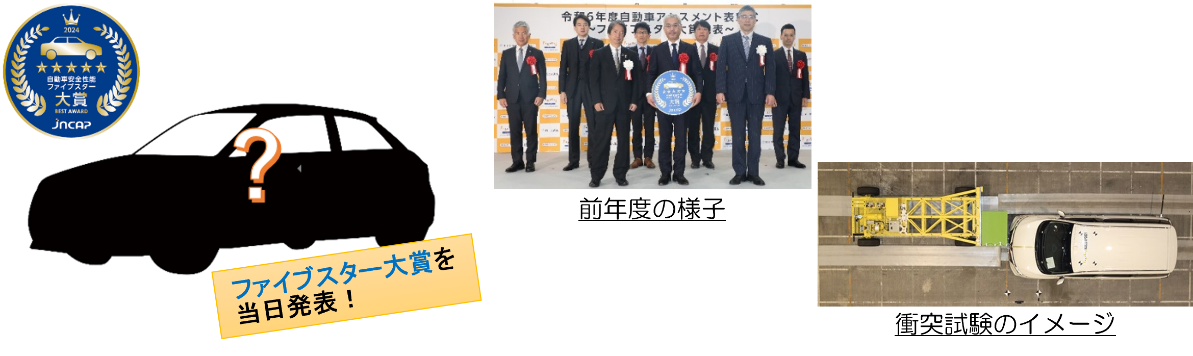 | 5月27日(火)、国土交通省とナスバが2024年度に行った自動車アセスメント(自動車安全性能2024)において、優れた成績を収めた車種を賞する「自動車アセスメント表彰式」を開催します。 表彰式では、「自動車安全性能2024 ファイブスター大賞」※の発表・表彰を行うとともに、同車種の評価において衝突試験を実施した実際の試験車両の展示を行います(報道関係者のみ事前申込制)。 ※最高評価(5★)を受けた中で最高得点を獲得した車種にファイブスター大賞を授与 5★:予防・衝突安全性能が最高ランクで、事故自動緊急通報装置を搭載した車種 |