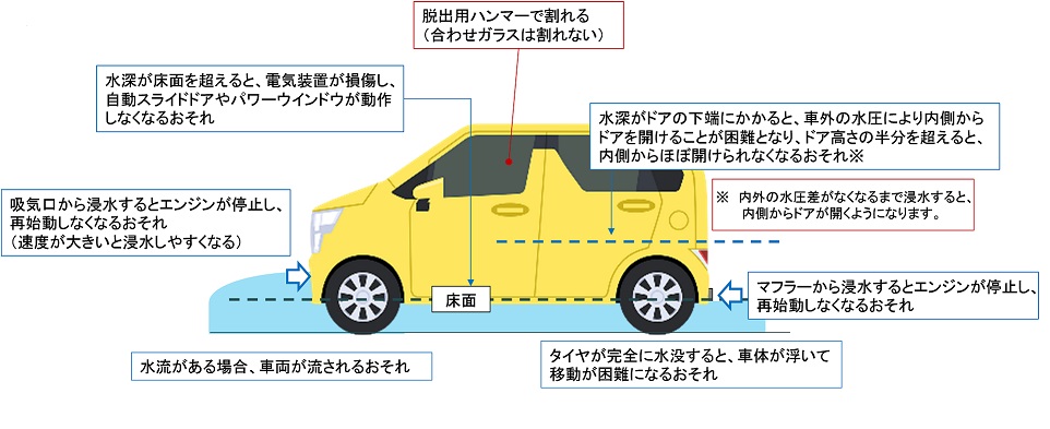 | 自動車が冠水した道路を走行する場合、水深が車両の床面を超えると、エンジン、電気装置等に不具合が発生するおそれがあります。また、水深がドアの高さの半分を超えると、ドアを内側からほぼ開けられなくなります。 |