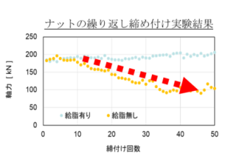 ・ボルト、ナットは適切に潤滑剤の塗布を行わない場合、締め付けを繰り返すたびに、締め付け力(軸力)が徐々に低下する(右上図)