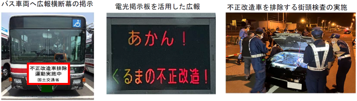 | 国土交通省では『不正改造車を排除する運動』として、関係省庁・団体※1 と連携し、不正改造を「しない」・「させない」ための啓発活動を行っております。その一環として、各地方運輸局等が定める「強化月間」が6月1日から始まり※2、街頭検査の実施など、安全・安心な車社会形成のための徹底した取組みを行います。 |