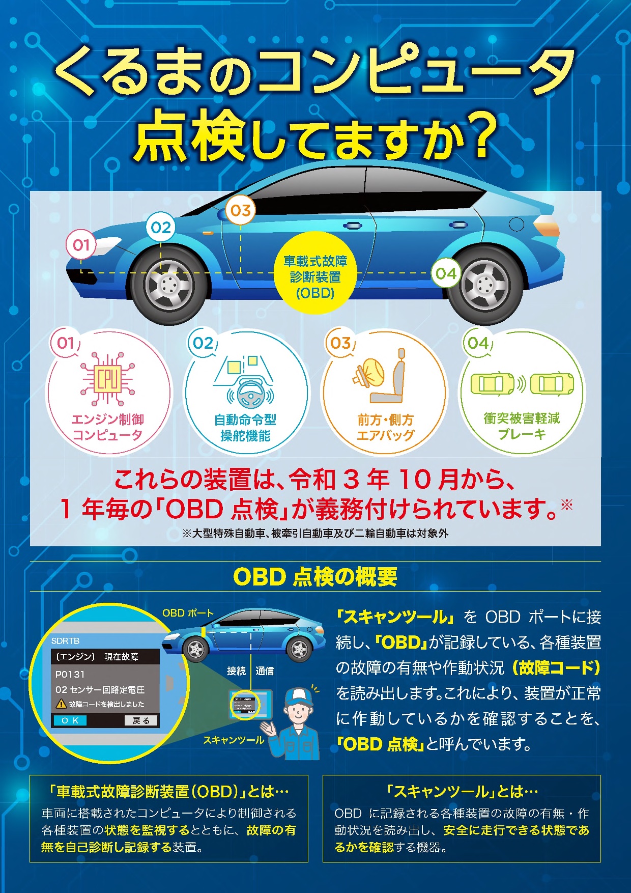 タイヤ等の点検整備やOBD点検の重要性の周知・啓発を行います(別紙2~6参照)。下記の「自動車点検整備推進運動HP」に、