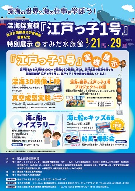 国土交通省海事局では、昨年の「江戸っ子1号プロジェクト」の海洋立国推進功労者表彰(内閣総理大臣表彰)受賞を記念して、「深海の世界と海の仕事を学ぼう!深海探査機『江戸っ子1号』特別展示inすみだ水族館」を開催いたします。