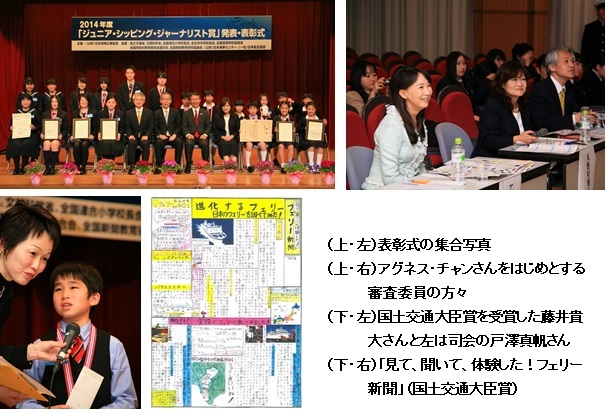 3月26日(木)、東京海洋大学越中島会館にて、審査委員にアグネス・チャンさん(歌手・教育学博士)等を招き、優秀賞の発表会及び授賞式が行われました。厳正審査の結果、7作品の中から国土交通大臣賞には横浜国立大学教育人間科学部附属鎌倉小学校4年藤井貴大さんの『見て、聞いて、体験した!フェリー新聞』が、日本海事広報協会会長賞には九州国際大学付属中学校新聞部の『夕日に染まる洞海湾』と富山高等専門学校2年の竹内めぐみさんと中原嶺太朗さんの『The Crew and Their Spirits for Cutter~カッターの起源、そして歩み・・・~』が選ばれ、松原国土交通省大臣官房審議官及び宮原日本海事広報協会会長から表彰されました。