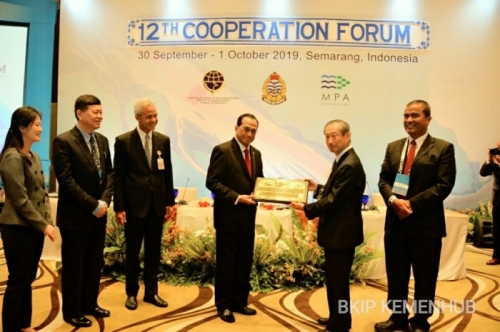 左から、カー・シンガポール海事港湾庁長官、バーリン・マレーシア海事局長、ガンジャル・中部ジャワ州知事、ブディ・インドネシア運輸大臣、宮﨑・マラッカ海峡協議会理事長、アグス・インドネシア海運総局長