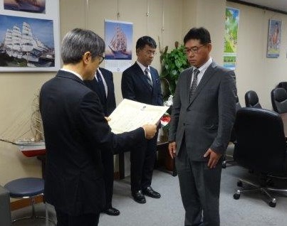 受賞者の浪速タンカー(株)からは福岡社長(左写真)が、 アジアパシフィックマリン(株)からは柳原執行役員(右写真)が出席され、 蒲生海事局長より表彰状が授与されました。