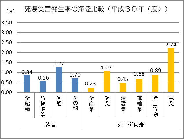 船員の労働災害については、関係者の努力により減少していますが、陸上労働者(0.2