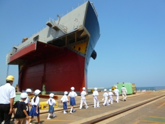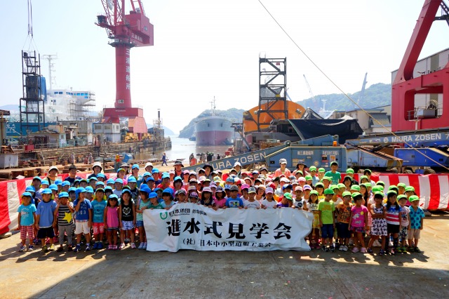 本見学会は、大型船や船に搭載する巨大なエンジン、配電盤を作っている現場、進水式典等を実際に見学することを通じて、次世代の海事人材を担う小中学生の船舶やものづくりに対する好奇心を喚起し、海や船、地元産業の大切さを理解する大切な機会を提供することを目的としています。