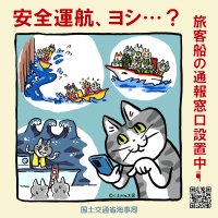 | 国土交通省海事局では、船舶運航事業者及び船員に対して、日々の安全運航を啓発するとともに、国民に対して、船の安全運航に興味・関心を持つ端緒となることを目的として、イラストレーターのくまみね氏の「仕事猫」とコラボした船舶の安全運航の啓発・周知ポスターを作成しました。 |