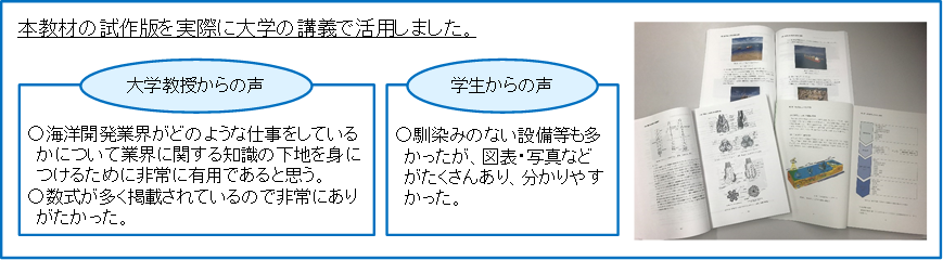 このため、国土交通省では、j-Oceanの一環として、大学生、大学院生や若手社会人などをターゲットに、海洋開発分野を切り拓く武器となる資源工学、造船工学、機械工学、電気工学、プロジェクトマネジメントなどの知識を体系的・包括的にカバーする専門教材の作成を平成29年度まで3年をかけて進めてきました。
