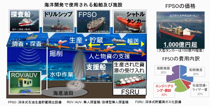 海洋開発は、多くの船舶が用いられ、その単価とエンジニアリング費の占める割合が高いことから、付加価値ビジネスにもつながるため、我が国海事産業にとって重要な分野です。現状、我が国周辺海域に資源開発フィールドが存在しないこともあり、我が国の関与は限定的であるため、この分野への進出に向けて、海事生産性革命(j-Ocean)を推進しています。