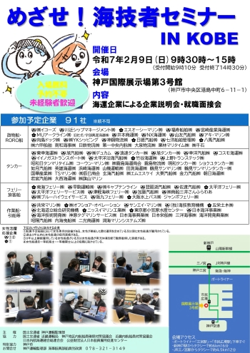 | 国土交通省においては船員の雇用のマッチングを図ることを目的に、「めざせ!海技者セミナー」を全国で開催しています。この度、神戸運輸監理部が主催する同セミナーにおいて、海運事業者による企業説明会等を実施いたします。船員になりたい方や船員の職業に興味をお持ちの方は、ぜひご参加ください。 |