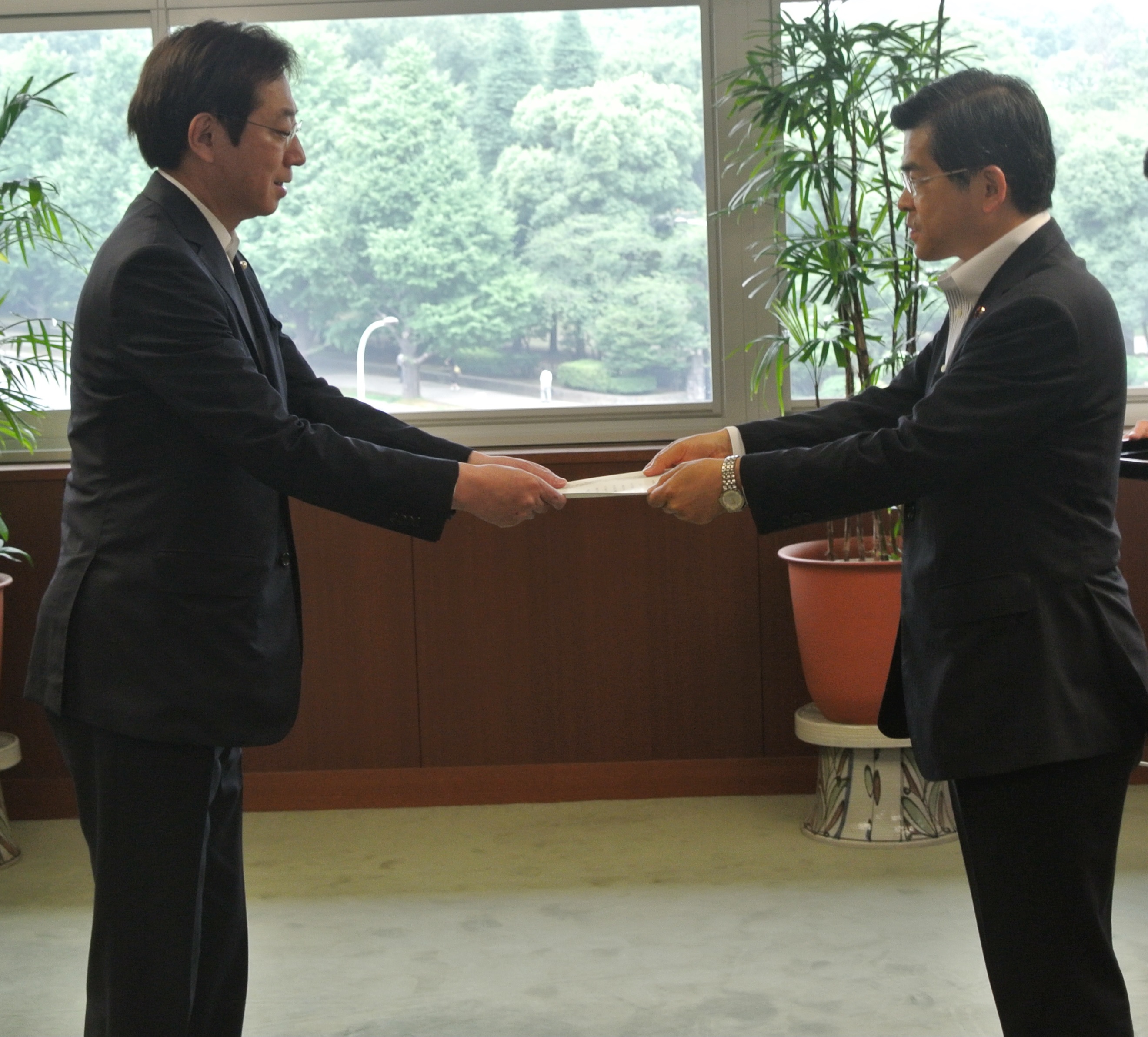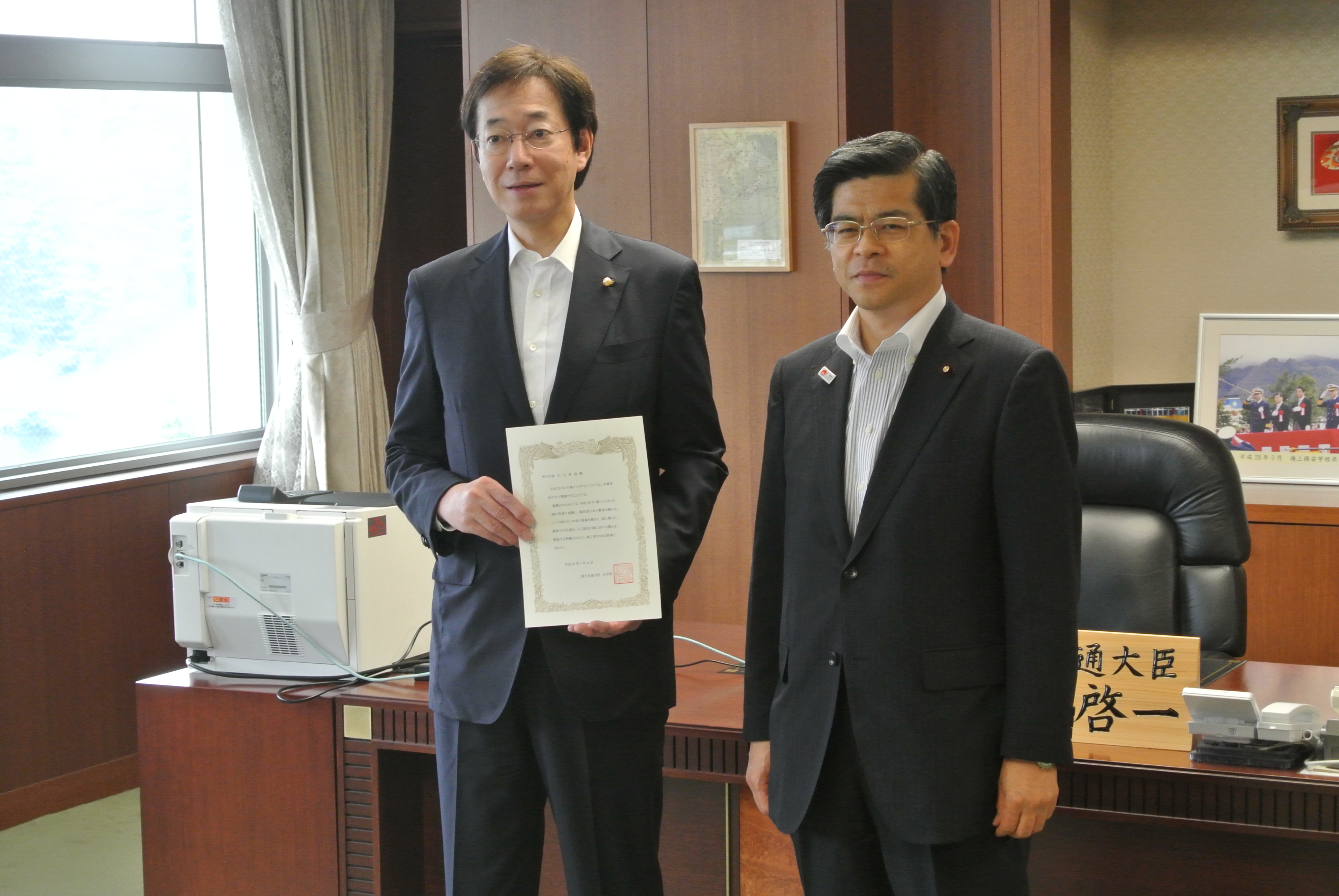 この度、平成29年の「海フェスタ」を、兵庫県神戸市で開催することに決定し、7月13日11:00、大臣室において、石井大臣から久元神戸市長に対し開催決定通知書を交付いたしました。