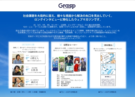 未来投資戦略などに関連する国土交通省の先進的な政策や取組を広く周知し、興味を喚起していくために、“広報改革”の戦略的施策として、11月30日よりスマホで見られるウェブマガジンの配信を開始いたします。月ごとに、政策や取組に呼応する社会課題をインタビューテーマとして設定し、視座の異なる3名のロングインタビュー記事を毎週配信。また、あまり知られていない国土交通省の所掌業務や職種をイラスト等で紹介するサブコンテンツも展開します。