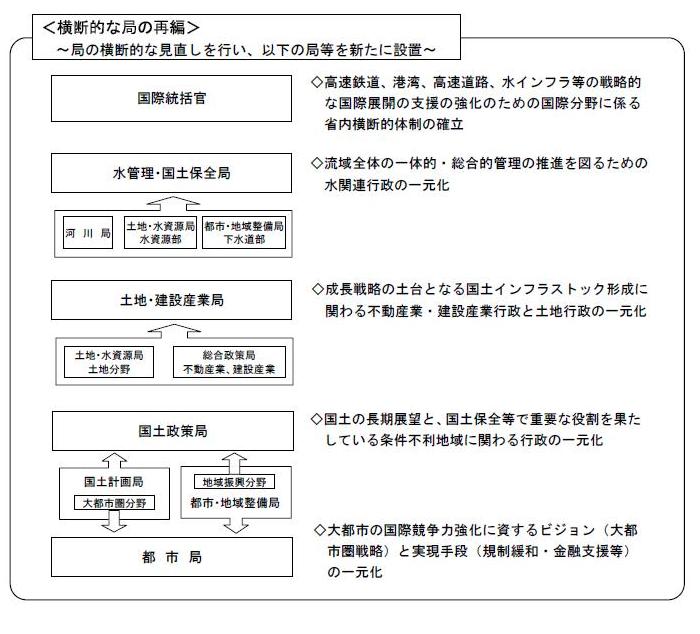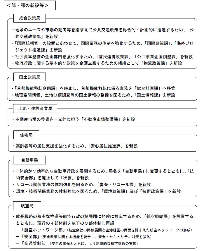 国土交通省においては、省内横断的な体制の確立や関連する行政の一元化等を図るため、横断的に局を再編するとともに、既存部局についても新たな政策課題等に対応するため組織の見直しを実施します。