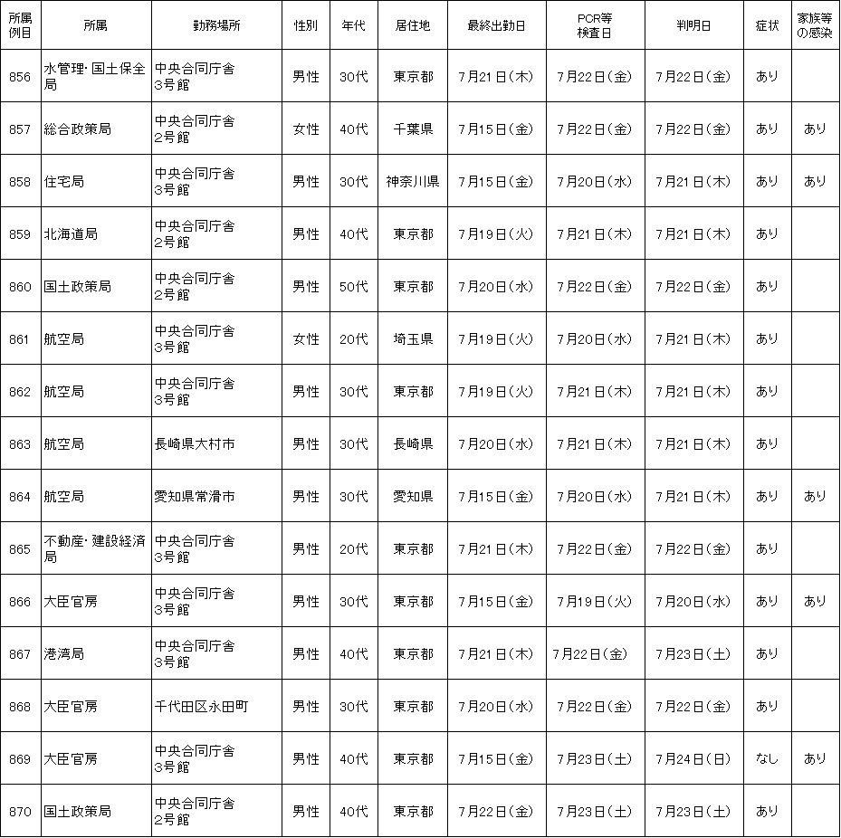新たに国土交通省本省職員15名(856~870例目)が、新型コロナウイルスに感染していることが確認されました。