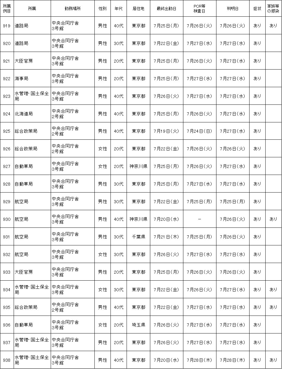 新たに国土交通省本省職員20名(919~938例目)が、新型コロナウイルスに感染していることが確認されました。