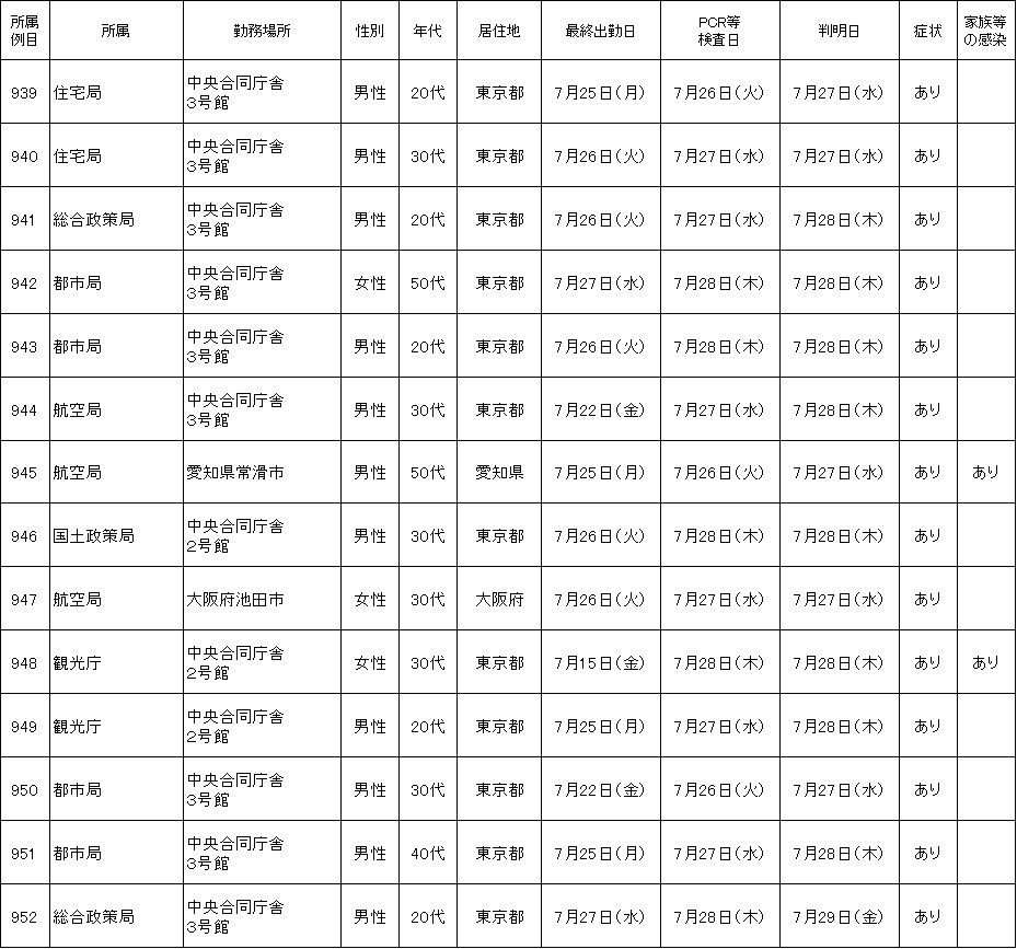 新たに国土交通省本省職員14名(939~952例目)が、新型コロナウイルスに感染していることが確認されました。