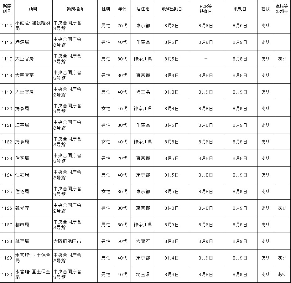 新たに国土交通省本省職員16名(1115~1130例目)が、新型コロナウイルスに感染していることが確認されました。