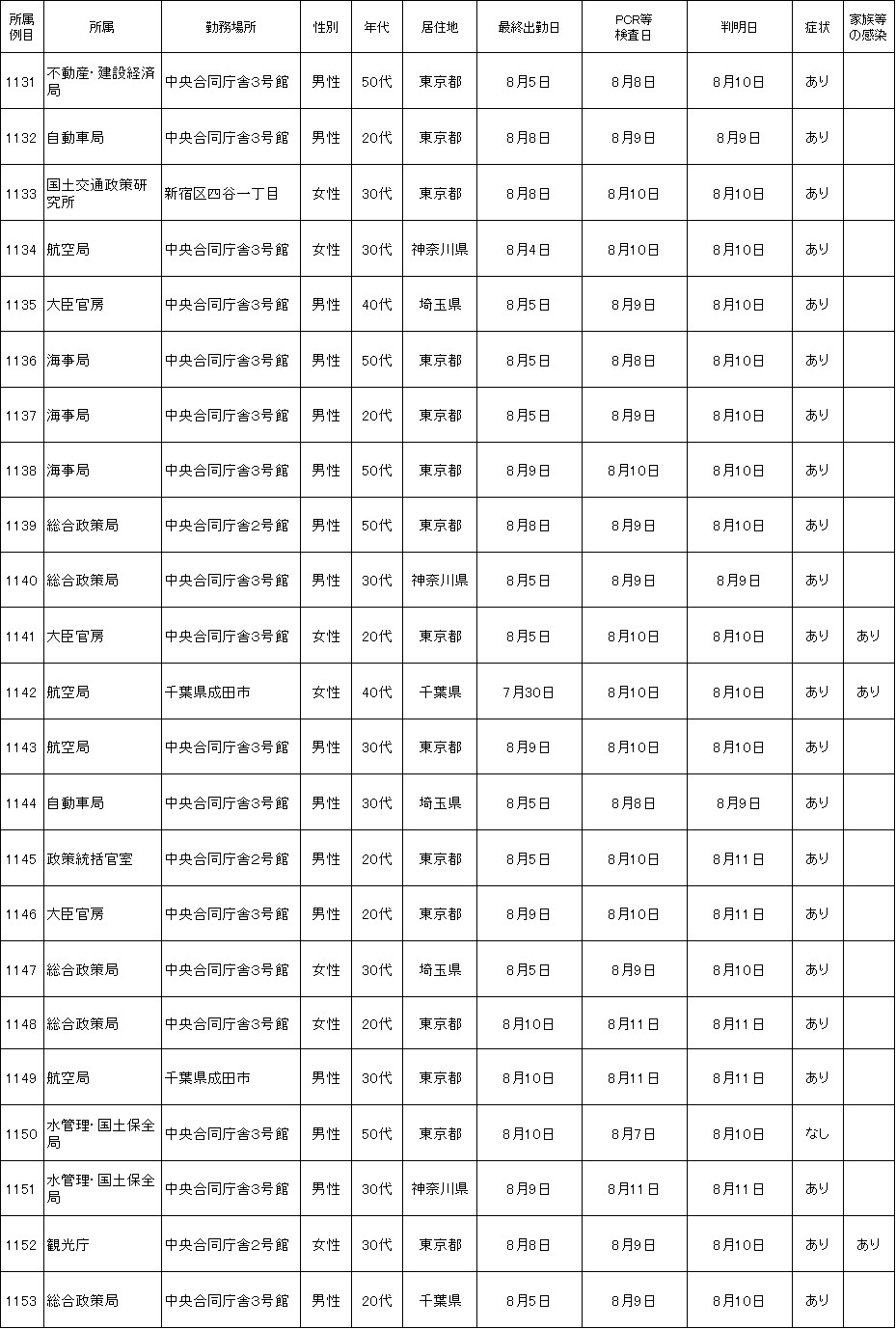 新たに国土交通省本省職員23名(1131~1153例目)が、新型コロナウイルスに感染していることが確認されました。