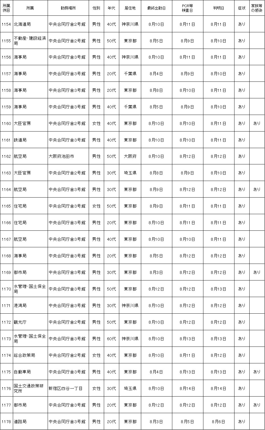 新たに国土交通省本省職員25名(1154~1178例目)が、新型コロナウイルスに感染していることが確認されました。