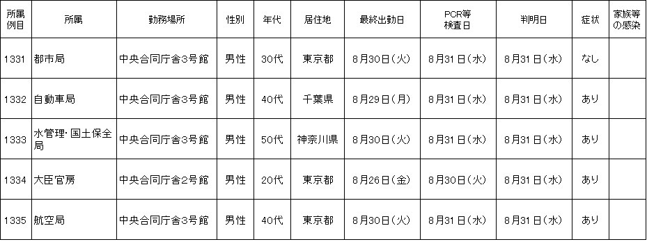 新たに国土交通省本省職員5名(1331~1335例目)が、新型コロナウイルスに感染していることが確認されました。