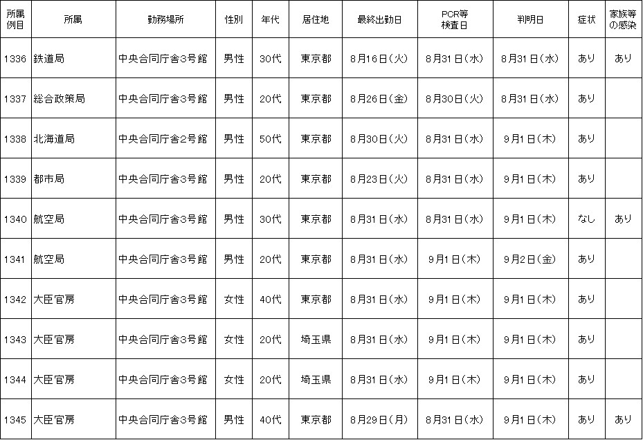 新たに国土交通省本省職員10名(1336~1345例目)が、新型コロナウイルスに感染していることが確認されました。