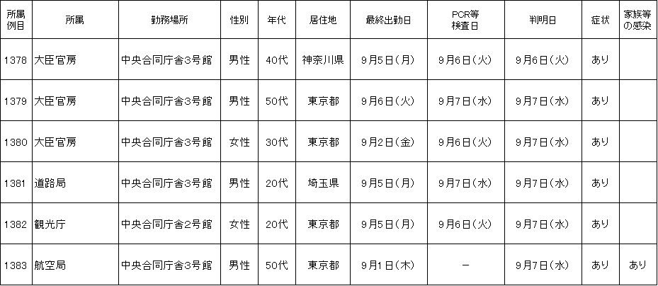 新たに国土交通省本省職員6名(1378~1383例目)が、新型コロナウイルスに感染していることが確認されました。