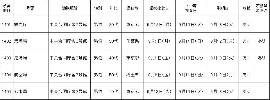 新たに国土交通省本省職員5名(1401~1405例目)が、新型コロナウイルスに感染していることが確認されました。