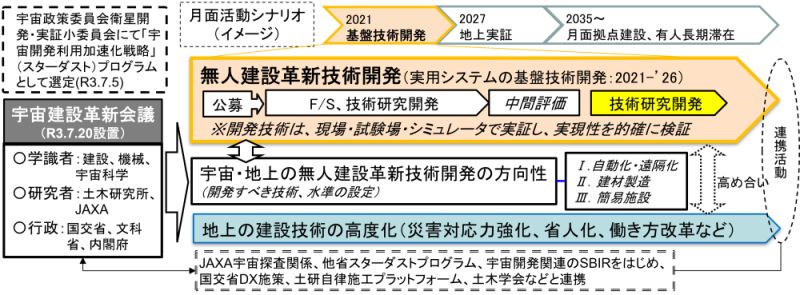 | 「宇宙開発利用加速化戦略プログラム」(スターダストプログラム)の一環として、令和3年7月に決定された「宇宙無人建設革新技術開発」(国交省及び文科省連携。略称、「宇宙建設革新プロジェクト」)の技術研究開発の実施対象『継続分』(計12件)を決定しました。(別紙1) 今後、府省横断の「宇宙を目指す建設革新会議」(略称、「宇宙建設革新会議」)(別紙2)の体制の下、当プロジェクト内外の関連事業と連携し、月面等の宇宙開発と地上の建設事業に貢献する技術研究開発を推進します。 |