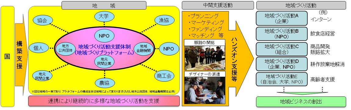 補助対象となる中間支援活動は地域づくり活動の自立・継続に向けた、プランニング、マッチング、マーケティング等のきめ細やかなアドバイス等を実施する活動であり、地域づくり活動(注)に対し、地域づくり活動支援体制の構成主体が連携して行う伴走型の支援(ハンズオン支援)活動とします。