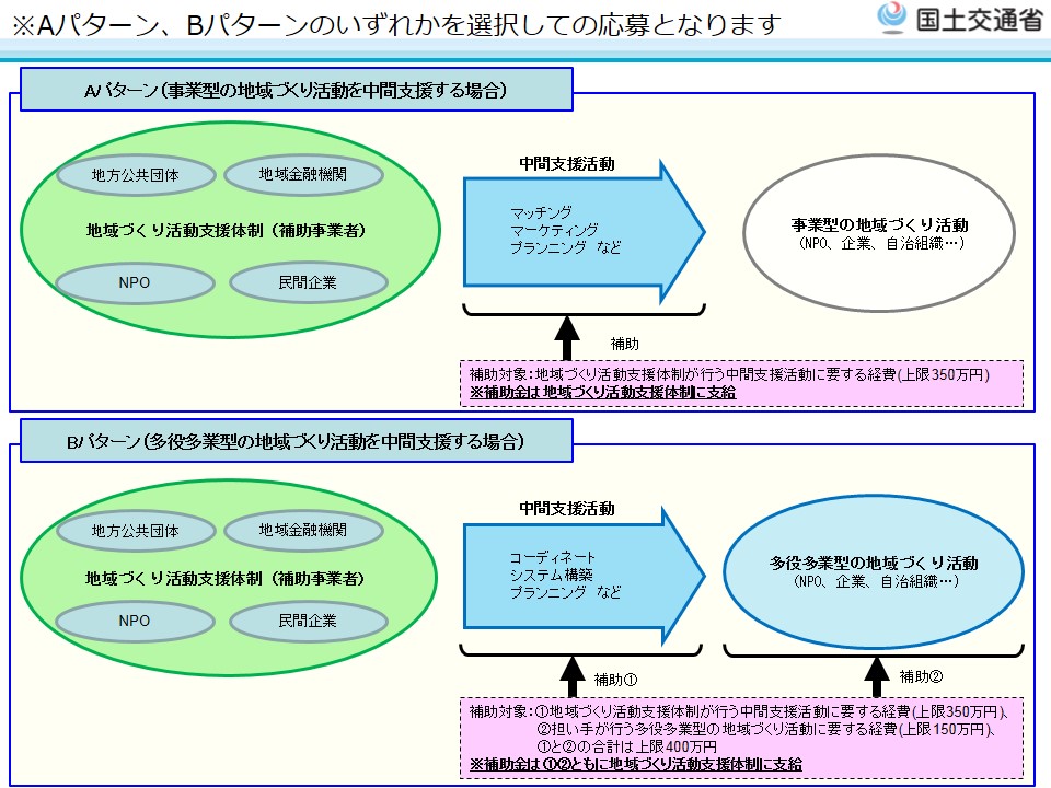 (1)補助対象となる中間支援活動は、地域づくり活動の自立・継続に向けた、プランニング、マッチング、マーケティング等のきめ細やかなアドバイス等を実施する活動であり、2(2)の要件を満たす地域づくり活動に対し、明確な事業計画・収支計画に基づき、地域づくり活動支援体制の構成主体が連携して行う伴走型の支援(ハンズオン支援)活動とします。